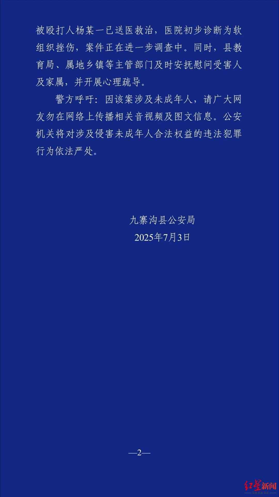 7月3日,九寨沟县公安局发布警情通报,6月29日11时许,该局接到杨某报警,称其13岁的妹妹杨某一(初一学生)被人殴打。警方立即立案调查,10名参与人在监护人的陪同下已全部到案接受调查。杨某一已送医救治,医院初步诊断为软组织挫伤,案件正在进一步调查中。