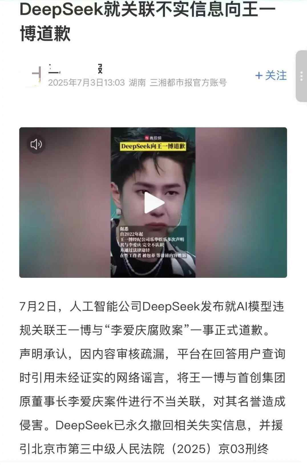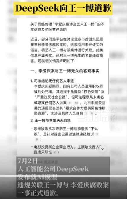 近日,一则“DeepSeek就AI模型违规关联向王一博道歉”的消息在网络疯传,引发广泛关注。据称,这家人工智能公司因内容审核疏漏,将王一博与“李爱庆腐败案”不当关联,损害了其名誉,并已作出正式道歉。