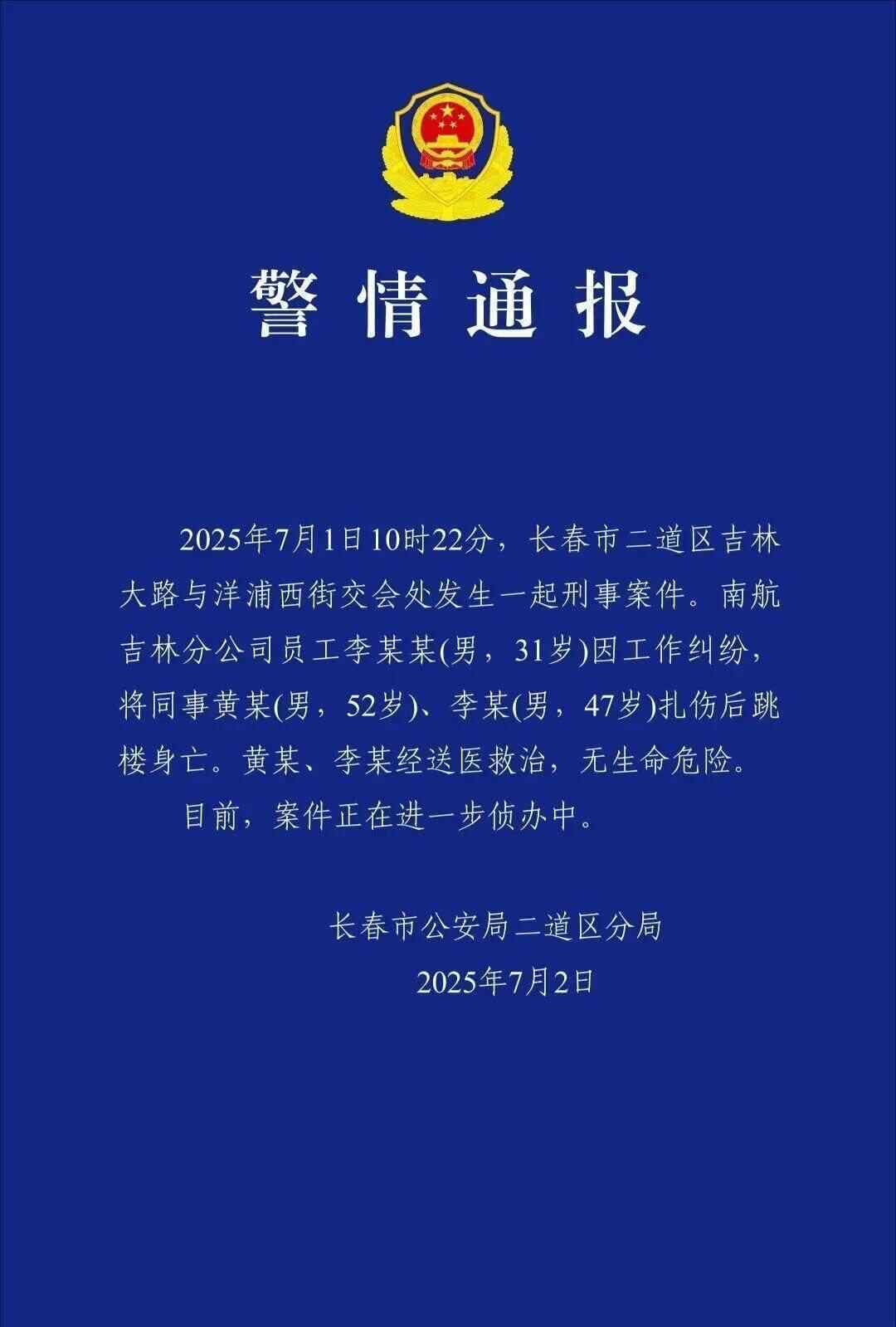 7月1日,南方航空公司吉林分公司发生一起伤人事件引发关注。之后长春市公安局二道区分局发布警情通报:2025年7月1日10时22分,长春市二道区吉林大路与洋浦西街交会处发生一起刑事案件。南航吉林分公司员工李某某(男,31岁)因工作纠纷,将同事黄某(男,52岁)、李某(男,47岁)扎伤后跳楼身亡。黄某、李某经送医救治,无生命危险。目前,案件正在进一步侦办中。