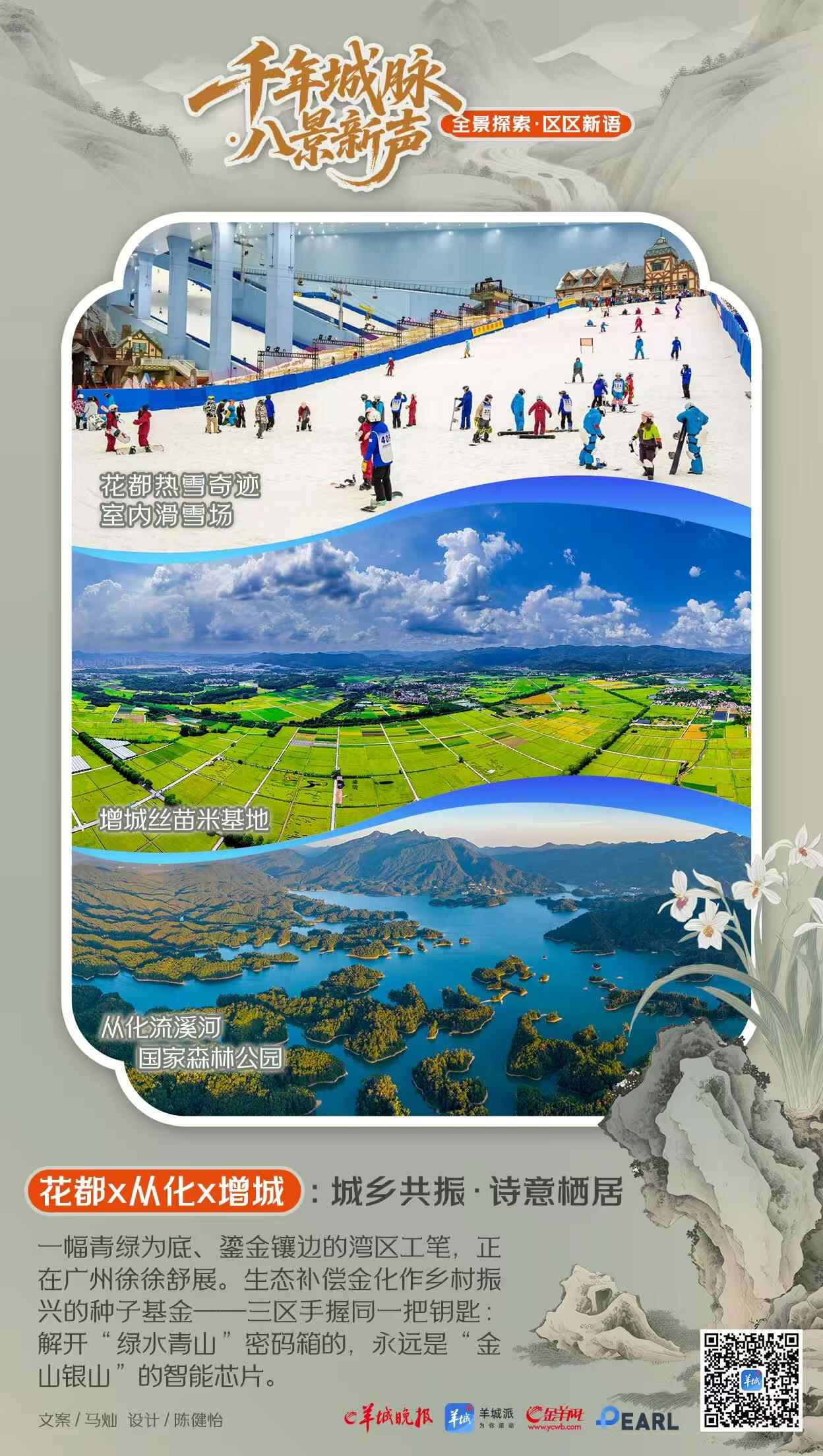 “无中生有”的冰雪世界,与广州花都周边山水田园、工业园区,构成紧密联动振兴图景;天人山水,百里流溪,万亩良田,从化正书写一幅色彩斑斓的时代画卷;绿脉为轴、产链共舞,依托高质量发展优势,增城全力打造东部中心名片。