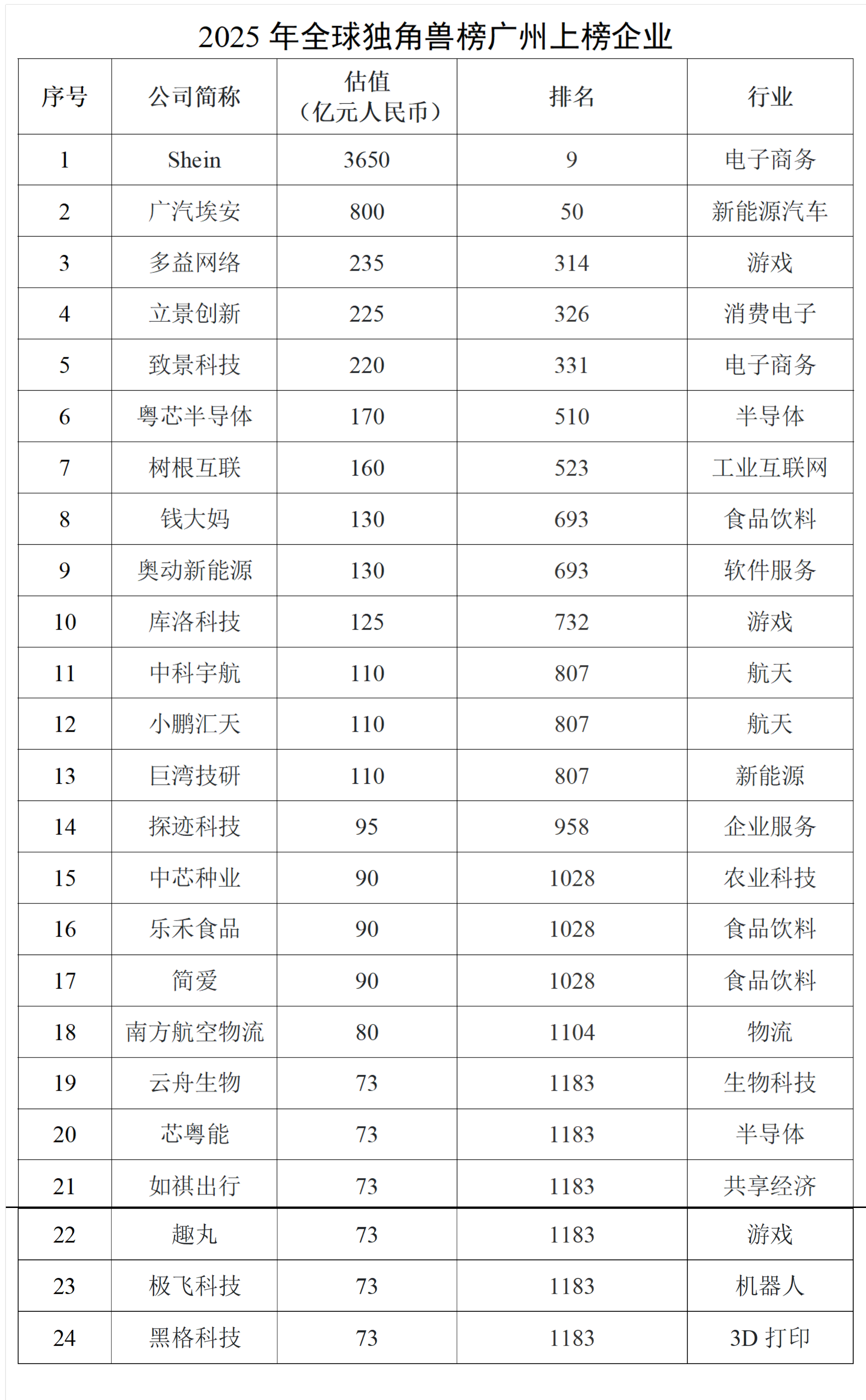 近日,胡润研究院于广州发布《2025全球独角兽榜》,列出了全球成立于2000年之后、价值10亿美元以上的非上市公司。数据显示,广州有24家企业登上全球独角兽榜,数量位列全球城市第11位,国内城市第4位。