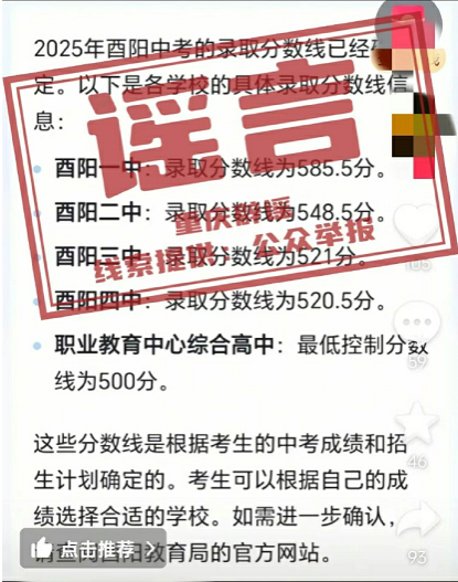 经向酉阳自治县教委核实,该信息为不实信息。网传信息中,酉阳一中、酉阳二中、酉阳三中的录取分数线是2022年的,酉阳四中和综合高中试点班的录取分数线是虚假信息。2025年酉阳普通高中录取工作将于2025年7月9日启动,高中录取分数线预计7月11日在县教委官方网站正式发布。目前,该视频已删除,警方正对造谣者展开调查。