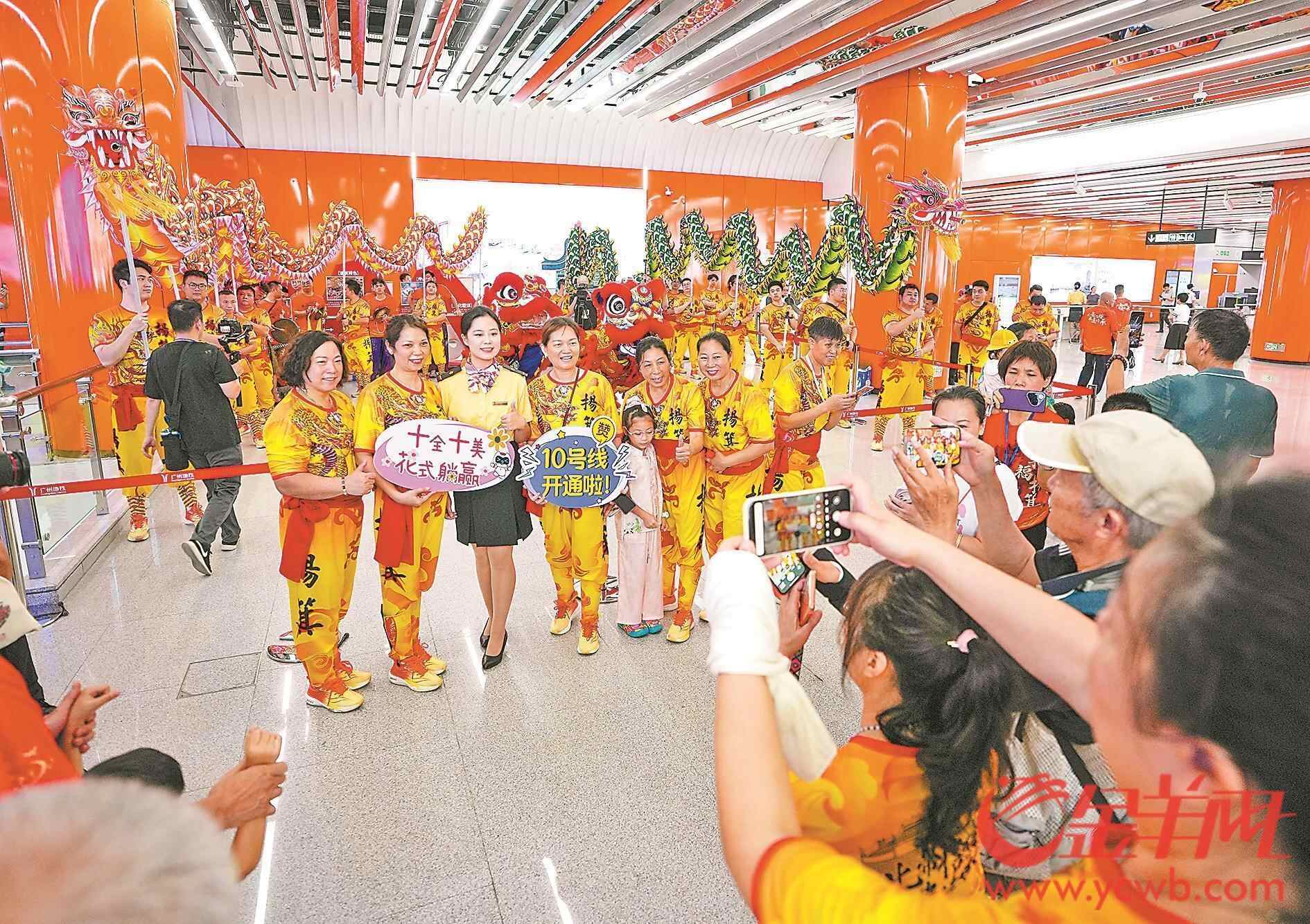 当日11时许,在10号线杨箕东站,杨箕村组织了舞龙舞狮队伍为10号线开通助兴。在1号线西塱站换乘10号线的通道入口,聚集了数十位市民等待开通。黎阿姨特意举着“10号线、12号线顺利开通”的牌子拍照留念。她兴奋地说:“我住在海珠,特意到西塱站坐10号线,想体验乘坐首班车。”