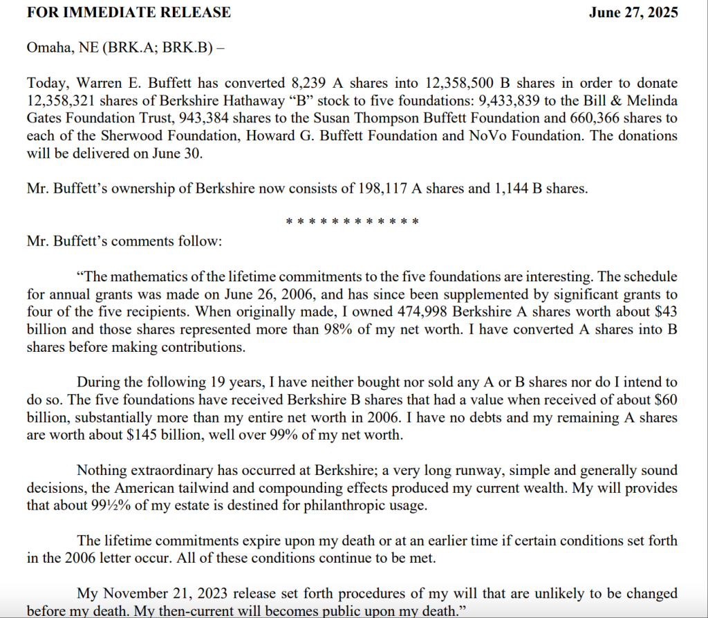 在伯克希尔发布的公告中,巴菲特详细阐述了2006年承诺背后的数学逻辑:“年度捐赠计划于2006年6月26日制定,并且此后通过向五家接受方中的四家进行重大捐赠进行了补充。当时,我持有474998股伯克希尔A类股,价值约430亿美元,这些股份占我净资产的98%以上。在捐赠前,我将A类股转换为B类股。这五家基金会收到的伯克希尔B类股,其价值在收到时约为600亿美元,远远超过我在2006年的全部净资产。我目前没有任何债务,剩余的A类股价值约为1450亿美元,占我净资产的99%以上。”