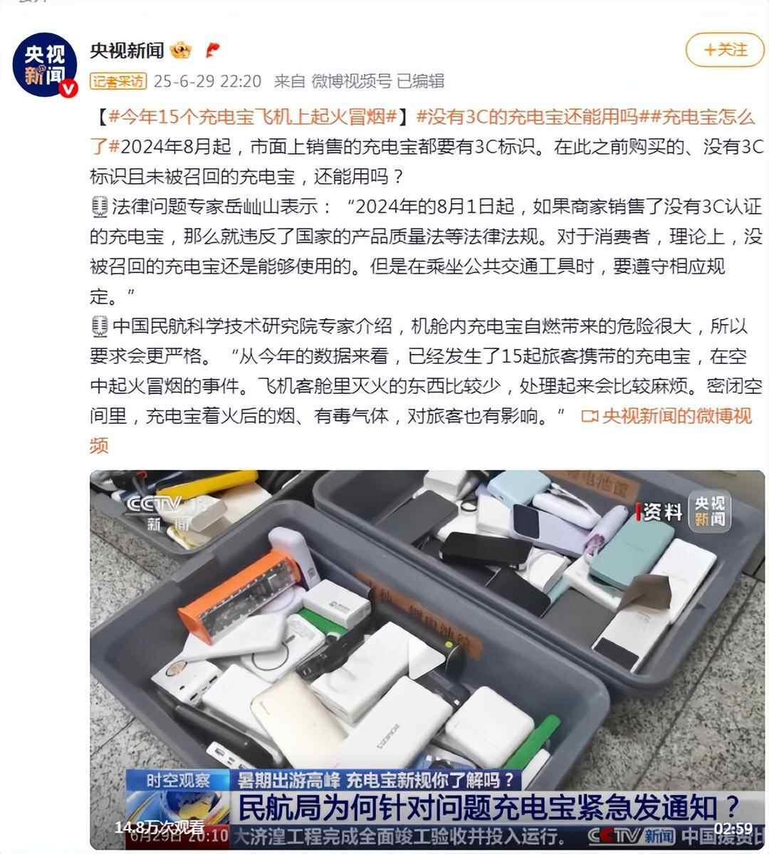法律问题专家岳屾山表示:“2024年的8月1日起,如果商家销售了没有3C认证的充电宝,那么就违反了国家的产品质量法等法律法规。对于消费者,理论上,没被召回的充电宝还是能够使用的。但是在乘坐公共交通工具时,要遵守相应规定。”