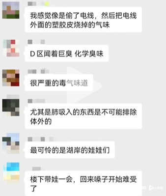 有居民发问:“现在好大烧塑料的味道,你们有闻到吗?”多位居民称:“关闭门窗都还有很大的臭味”“今天真的巨臭,感觉是焊锡和塑料溶解的气味”“今晚味道特别浓,以前我没什么感觉”“还以为哪里着火了,后来发现是外面传来的”“好臭,以为是我们家电视烧焦了”。