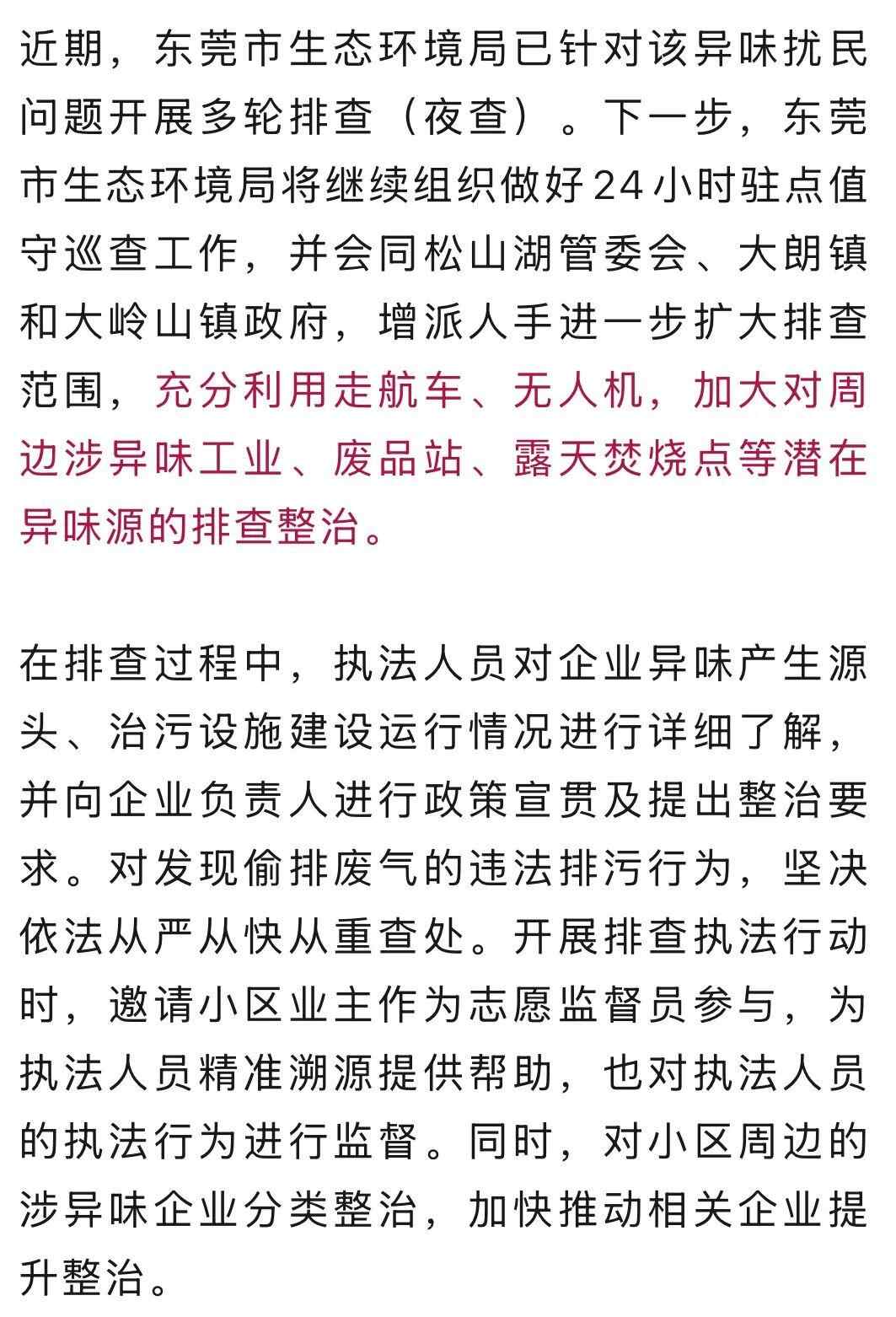 当天夜晚,东莞市生态环境局继续组织24名环境执法人员,于21点和次日凌晨2点开展夜间溯源排查行动,排查了区域内150家重点涉异味企业,发现13家企业有开工生产,执法人员在现场未闻到明显异味。