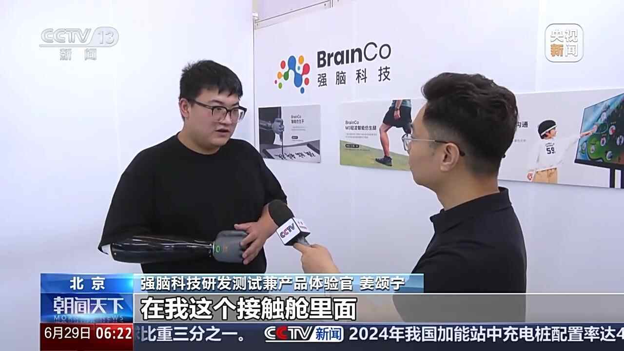 强脑科技研发测试兼产品体验官 姜颂宁:当我们大脑去想某一个动作的时候,它就会产生神经电和肌电信号。在我这个接触舱里面有一圈传感器来采集神经电和肌电信号,再通过AI算法倒推运动意图,来实现智能仿生手的运动。