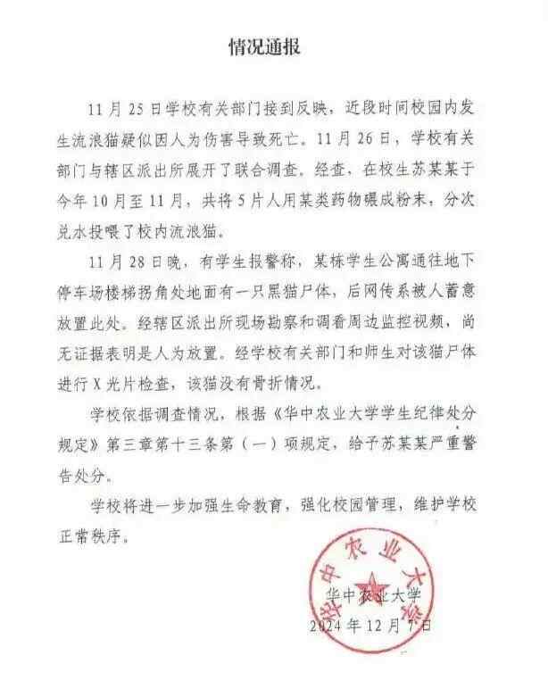 2024年12月7日,华中农业大学曾发布情况通报称,在校生苏某某于10月至11月,共将5片人用某类药物碾成粉末,分次兑水投喂了校内流浪猫。学校依据调查情况,根据《华中农业大学学生纪律处分规定》第三章第十三条第(一)项规定,给予苏某某严重警告处分。