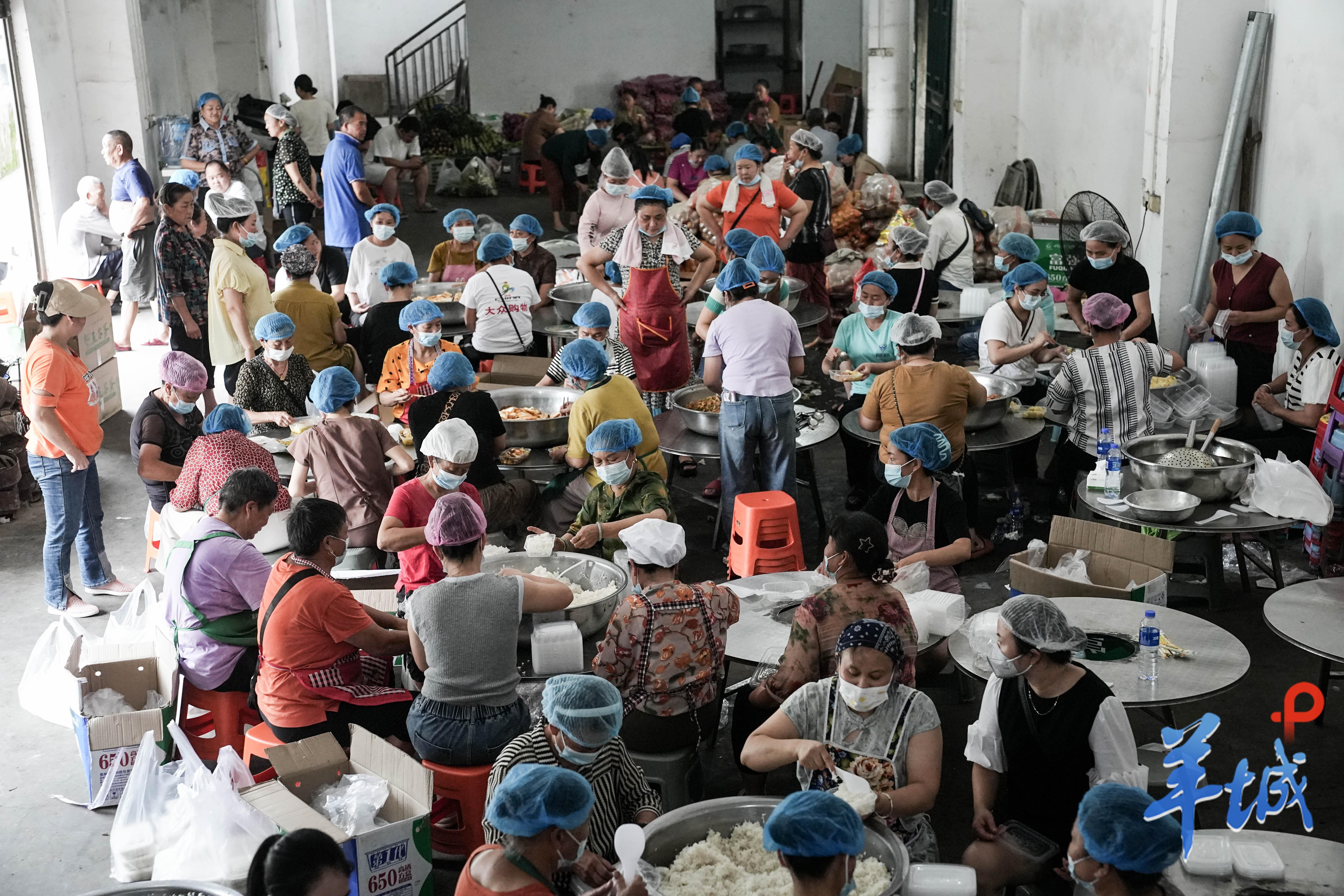 在村委食堂,洗菜声、切菜声、炒菜声交织在一起,香气四溢。“我们分工明确,有人负责洗菜切菜,有人负责掌勺烹饪,有人负责打包送餐。”王云介绍道。