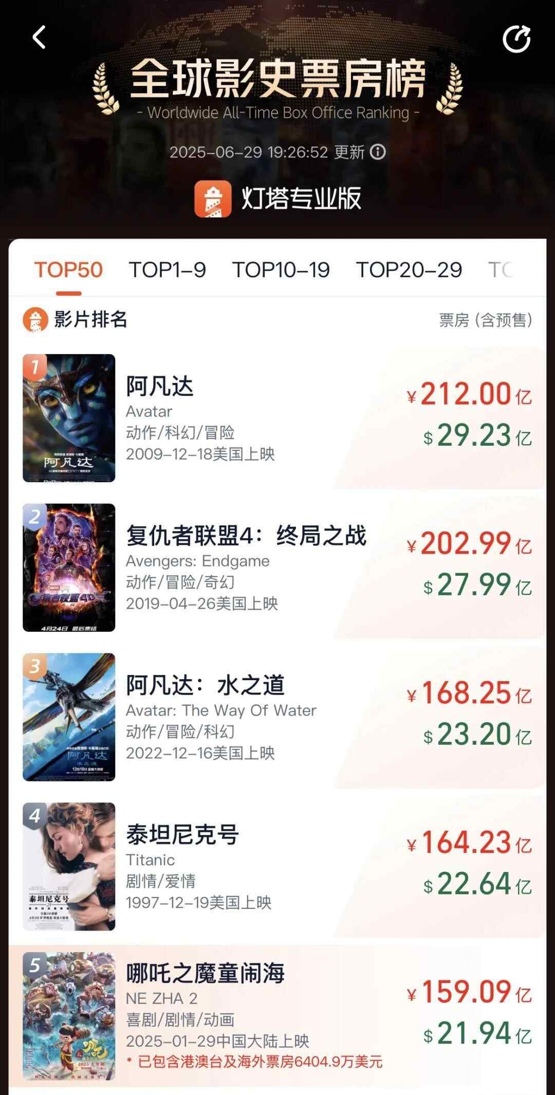 据灯塔专业版数据,截至发稿,《哪吒2》累计票房已突破159.09亿,排全球影史票房榜第5,创造了多项影史新纪录。