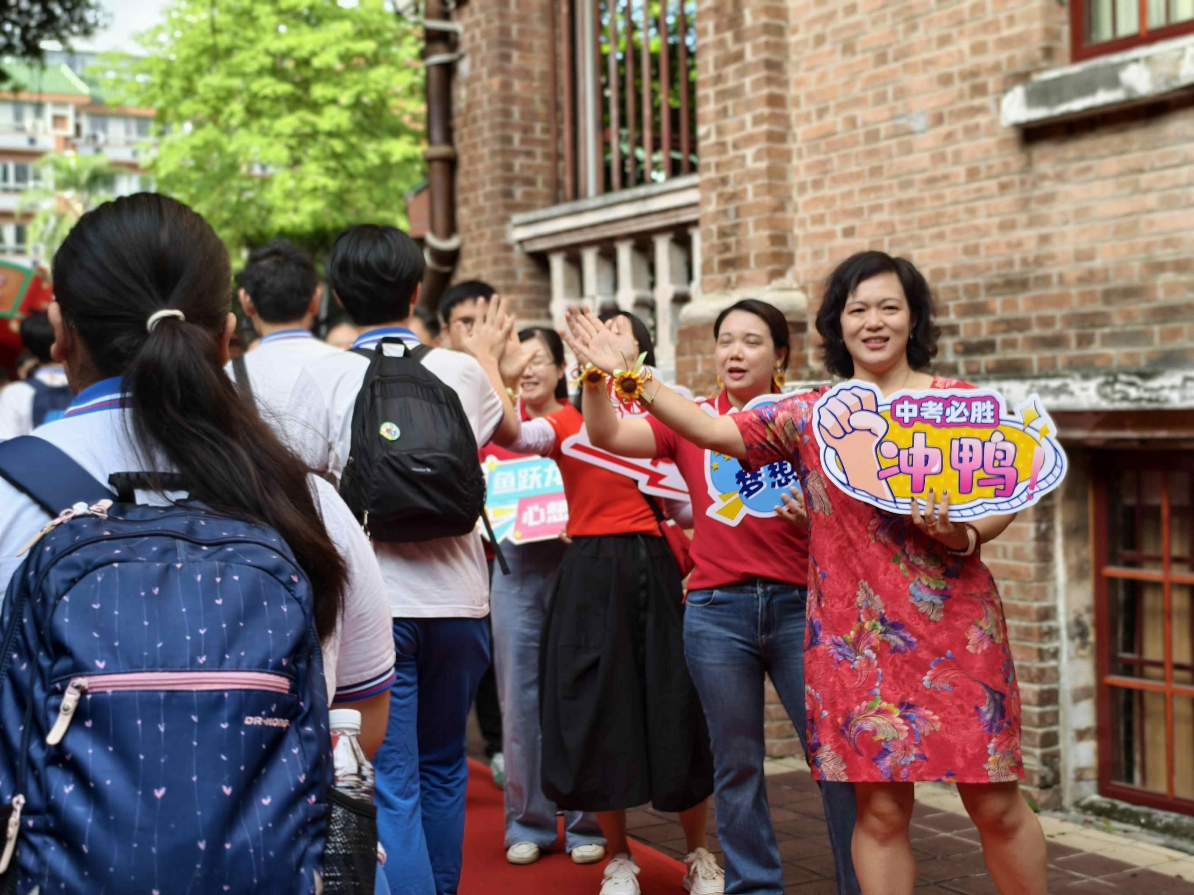 广州市培正中学初三年级的老师们身着象征“开门红”的鲜艳红衣,在校门两侧整齐列队。他们面带笑容,与每一位踏入考场的考生一一击掌,送上再三的叮咛与真挚的祝福。“笔下生花,文惊四座!”“蟾宫折桂,舍你其谁!”……激昂的加油助威声此起彼伏,点燃了考前的斗志。