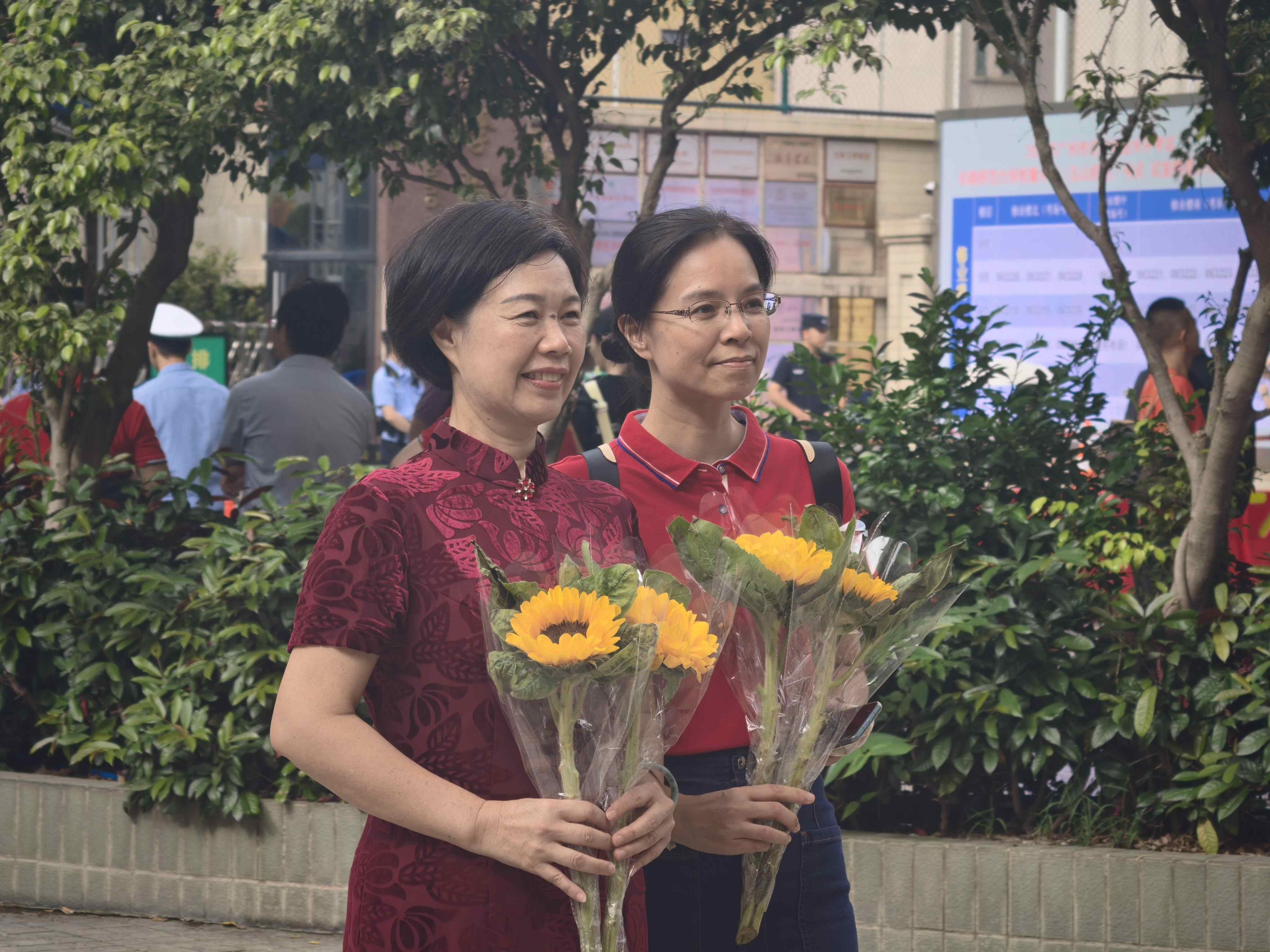 清晨的考点外,不乏暖心的小仪式。广州市第七中学考点门口,某班级家委们特意定制了绘有灵动锦鲤图案的红色T恤,家长们身着“战袍”,寓意“锦鲤附体”,为孩子们讨个好彩头。更有家长手持盛放的向日葵与精致的绣球花束,寄托着“一举夺魁”、“锦绣前程”的美好祝愿。