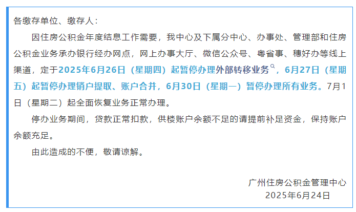 因住房公积金年度结息工作需要,我中心及下属分中心、办事处、管理部和住房公积金业务承办银行经办网点,网上办事大厅、微信公众号、粤省事、穗好办等线上渠道,定于2025年6月26日(星期四)起暂停办理外部转移业务,6月27日(星期五)起暂停办理销户提取、账户合并,6月30日(星期一)暂停办理所有业务。7月1日(星期二)起全面恢复业务正常办理。