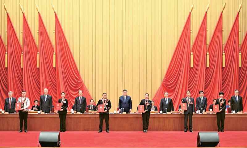 2024年9月27日,全国民族团结进步表彰大会在北京举行。这是习近平等为受表彰的模范个人和模范集体代表颁奖。 新华社记者 李学仁/摄