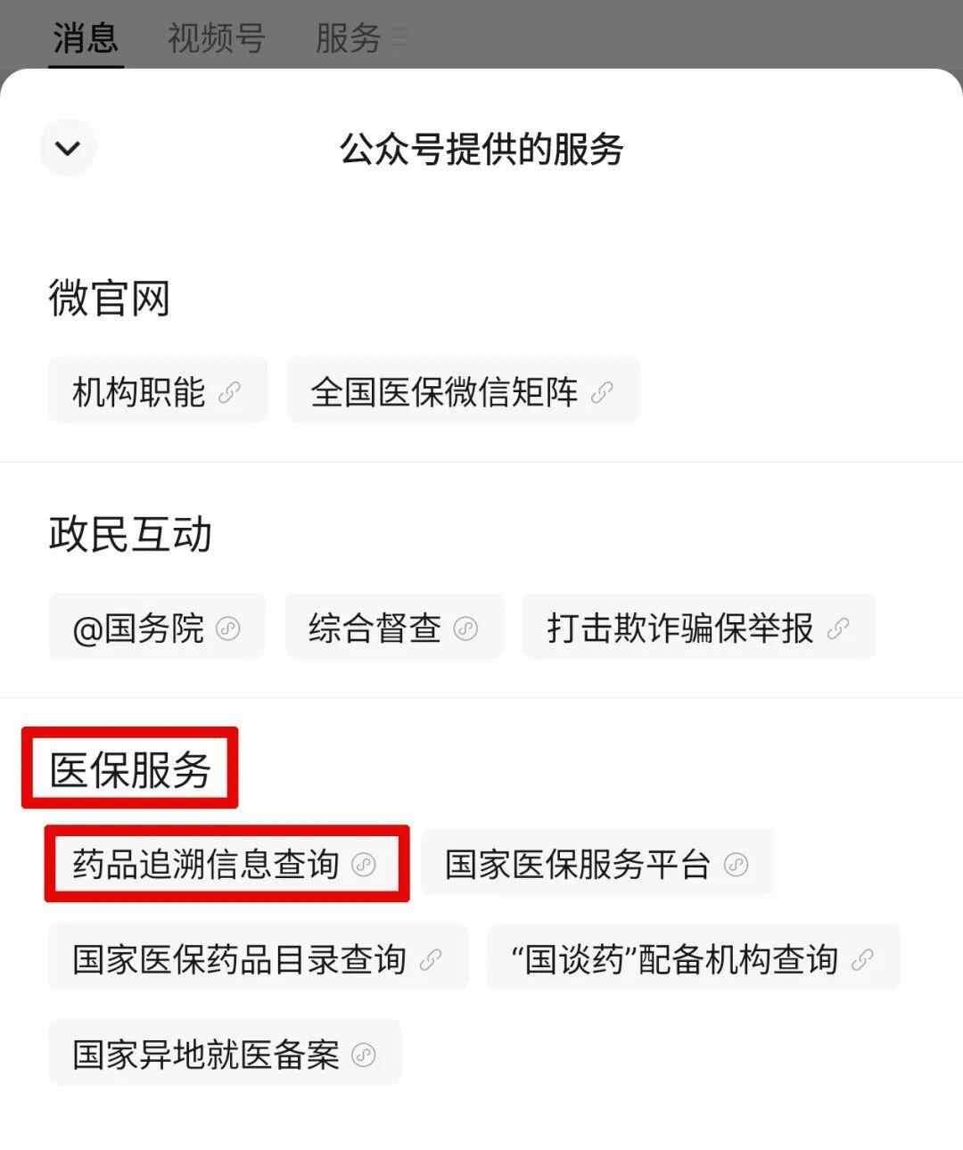 第一步:进入“国家医保局”微信公众号主页,点击服务→药品追溯信息查询,进入查询页面;