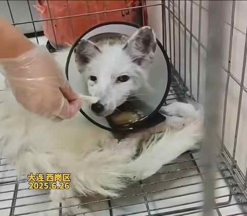 该工作人员说,这只白色狐狸经诊断,患有严重的皮肤病,还有贫血症状,目前对人有攻击性,待其恢复健康后再看如何处理。