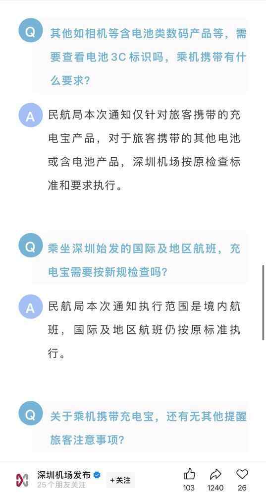 深圳机场方面表示,民航局本次通知仅针对旅客携带的充电宝产品,对于旅客携带的其他电池或含电池产品,深圳机场按原检查标准和要求执行。