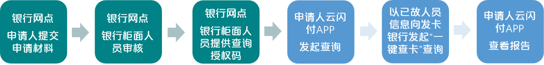 在具体流程方面,申请人需要前往受理银行网点,提交已故人员和申请人的姓名、身份证号等身份信息及证明材料。网点工作人员审核通过后,生成授权码给到申请人。申请人使用身份证实名注册并登录云闪付APP,在首页搜索“已故人员银行卡账户线索跨行查询”功能,完成相关信息录入和验证后发起查询申请,查询成功后,云闪付APP会在24小时内生成查询报告并短信通知用户。
