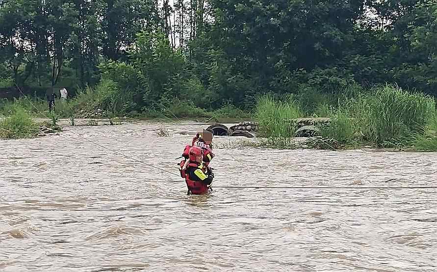 6月29日,受强降雨影响,四川省乐山市市中区棉竹镇境内一处河流水位暴涨,两名成年男子和一名小孩被困在河道中央的“孤岛”。危急关头,当地消防救援人员及时赶到现场,先后将3人全部营救上岸。