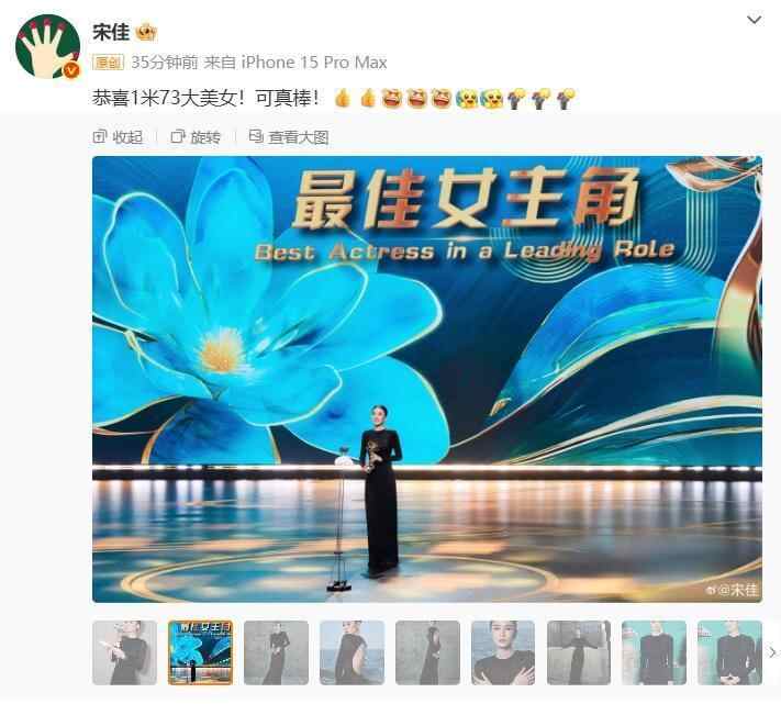 宋佳在微博配文:“恭喜1米73大美女!可真棒!”附上了自己亲吻白玉兰奖杯的照片。