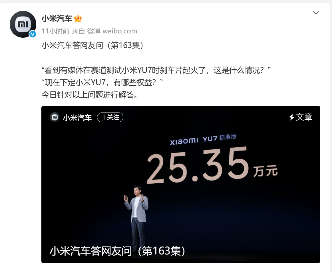 6月28日晚,@小米汽车 就“看到有媒体在赛道测试小米YU7时刹车片起火了,这是什么情况?”等问题回应网友提问(小米汽车答网友问第163集)。