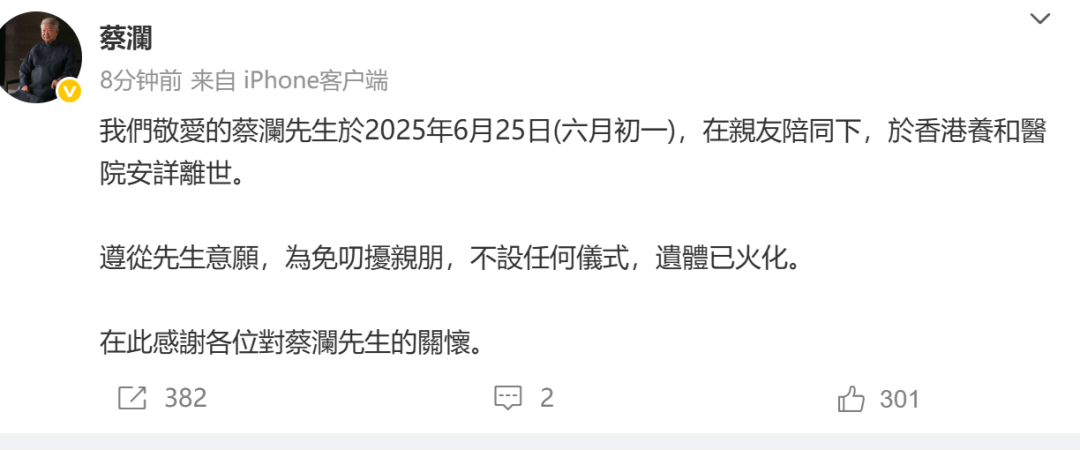 6月27日,蔡澜官方微博发布消息宣布了蔡澜先生已在25日安然离世的消息,其称,遵循先生意愿,不设任何仪式,遗体已火化。
