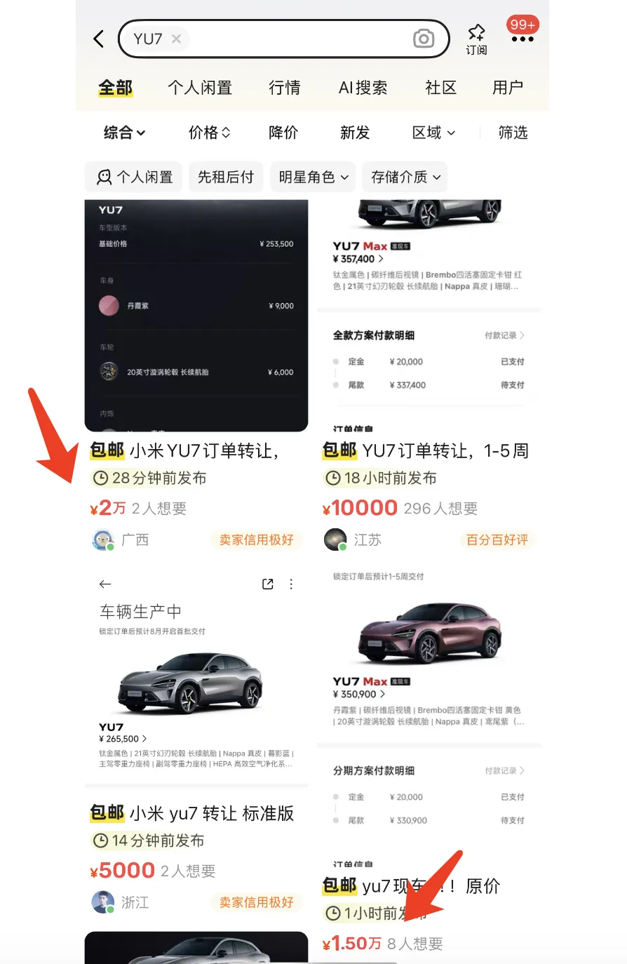 一位黄牛告诉记者,目前只收“准现车”YU7 Max版本,因为标准版本和Pro版本的交付周期尚未确定,难以确认是否能年内提车。目前给到车主的溢价是4000元,但转卖出手的价格则高达1.7万元。
