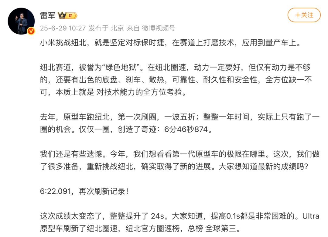 6月29日上午,小米创办人、董事长兼CEO雷军在其个人微博发文表示,小米Ultra第一代原型车今年重新挑战了纽北,并以6:22.091的成绩再次刷新纪录,相比去年提升了24s。
