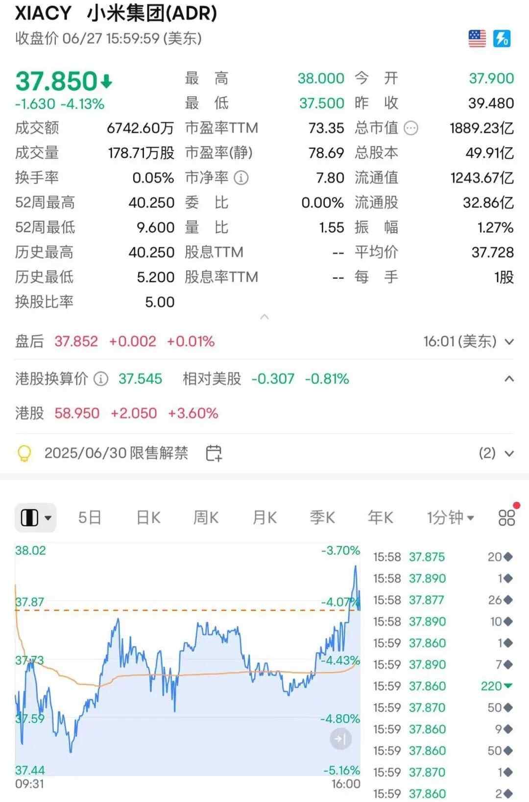二级市场上,小米集团股价27日开盘一度涨8%创纪录新高,截至当日收盘,公司股价上涨3.6%,市值增长约532亿港元(约合人民币486亿元)。小米美股ADR周五跌4.13%,报37.85美元。