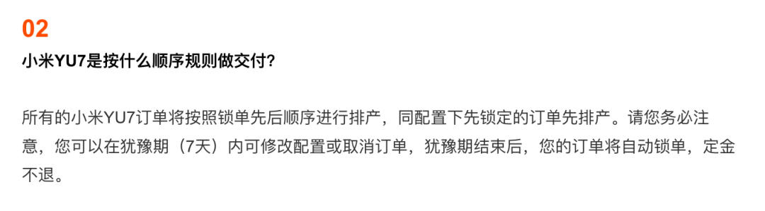 6月28日凌晨,小米汽车针对“小米YU7是按什么顺序规则做交付?”问题回答表示,所有的小米YU7订单将按照锁单先后顺序进行排产,同配置下先锁定的订单先排产。客户可以在犹豫期(7天)内可修改配置或取消订单,犹豫期结束后,订单将自动锁单,定金不退。