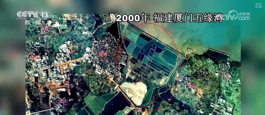 原先在五缘湾的内湾,几乎看不见海水,里面遍布着密密麻麻的长方形格子,也就是养殖鱼塘。而原先这片被堵死的水域现在碧波万顷,两岸绿意盎然,建筑规划合理有序。