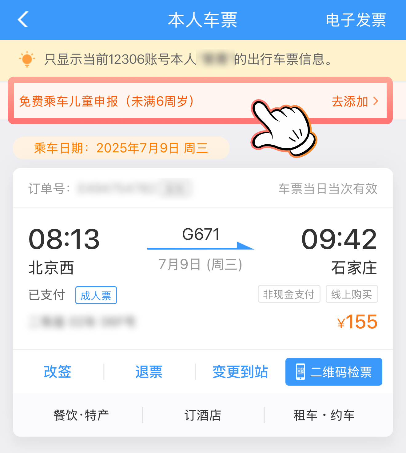 ③完成乘车人信息添加后,选定车次进入预订页面。勾选已添加的儿童信息,支付后即可完成购票。