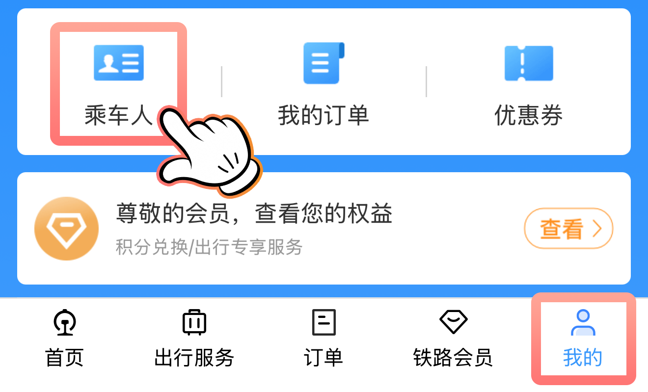 ①首先,打开铁路12306App,点击【我的】-【乘车人】。