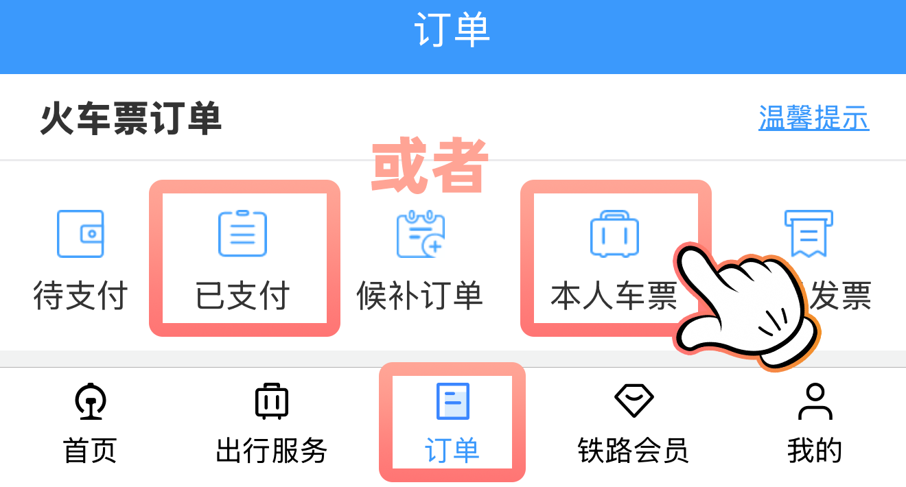 ①成人旅客购票后,点击【订单】-【已支付】,也可点击【订单】-【本人车票】找到申报入口。