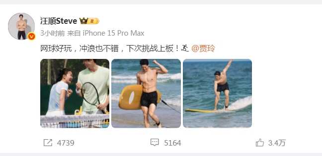 @汪順Steve:网球好玩,冲浪也不错,下次挑战上板!@贾玲