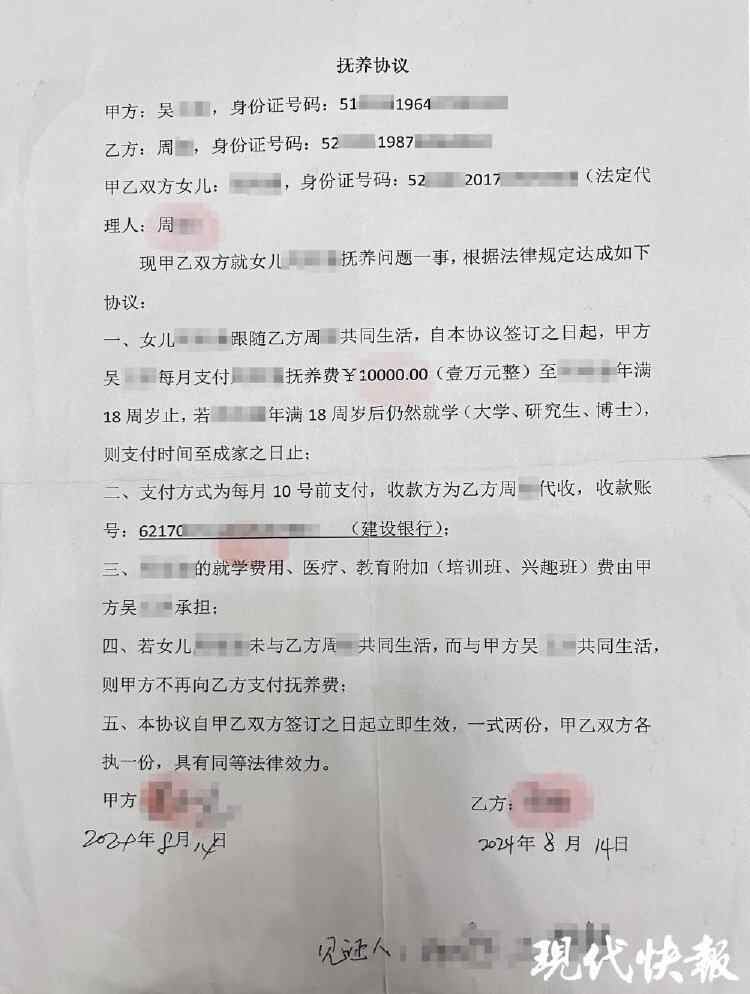 2024年8月14日,双方达成了一份《抚养协议》:女儿跟随周某生活,吴某某每月支付孩子抚养费1万元,至孩子年满18周岁止,若孩子年满18周岁后仍然就学(大学、研究生、博士),则支付时间至成家之日止。此外,双方还约定,吴某某要负担孩子的就学、医疗、教育附加费(培训班、兴趣班)等费用。