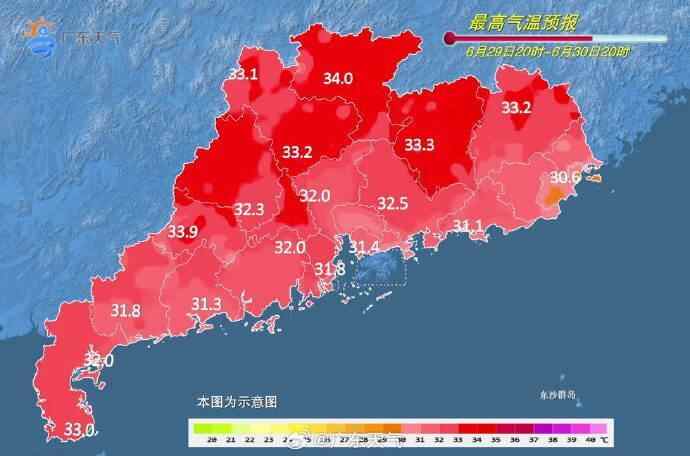 6月30日,清远、粤西沿海、粤东和珠江三角洲大部市县多云间阴天,有中(雷)雨局部暴雨,其余市县多云,有(雷)阵雨局部大雨。最高气温:南部市县30℃~32℃,北部市县32℃~34℃。