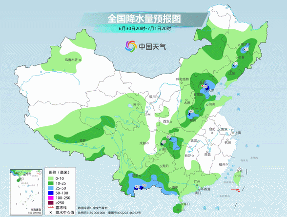 6月30日,多云间阴天,有雷阵雨局部暴雨,25℃到32℃;
