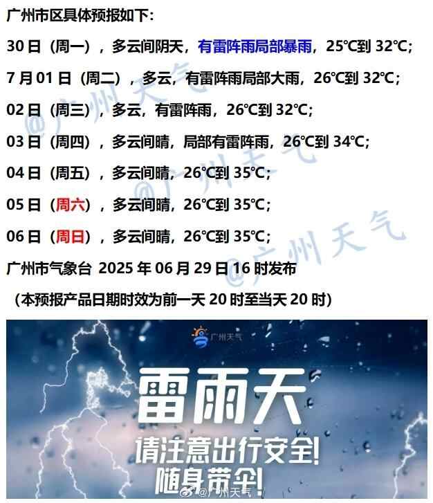 广州方面,天气在“水深”和“火热”间切换,本周前半段主打短时强降水、雷电等强对流天气,后半段天气趋向高温炎热,以多云间晴为主。