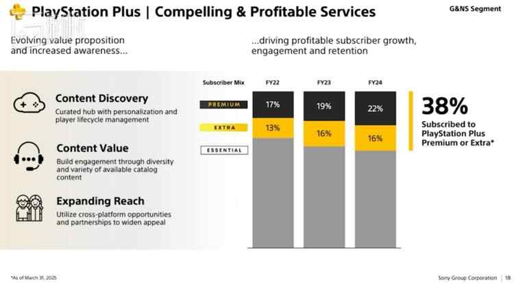 根据外媒VGC的报道,索尼最近举办了一次投资者会议,SIE总裁兼首席执行官西野秀明在会上表示,越来越多的用户选择 Premium(三档)和Extra(二档)会员服务,从图表来看选择中高级会员的人数比例逐年上升,到了2024财年,中高级会员人数约占PS PLUS总用户数的38%。