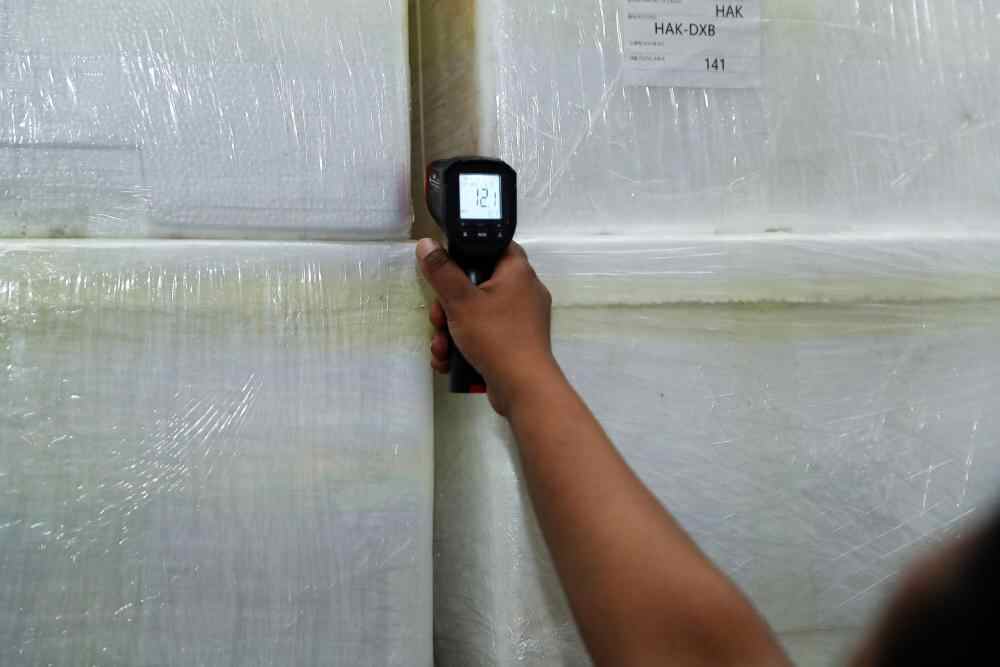 自4月中旬起,广东的妃子笑、白糖罂等优质荔枝品种陆续上市。今年出口迪拜的最后一批妃子笑6月20日一早抵达迪拜机场,温超员工采用“三班倒”方式提货,确保荔枝48小时内完成“采摘到上架”的全流程。
