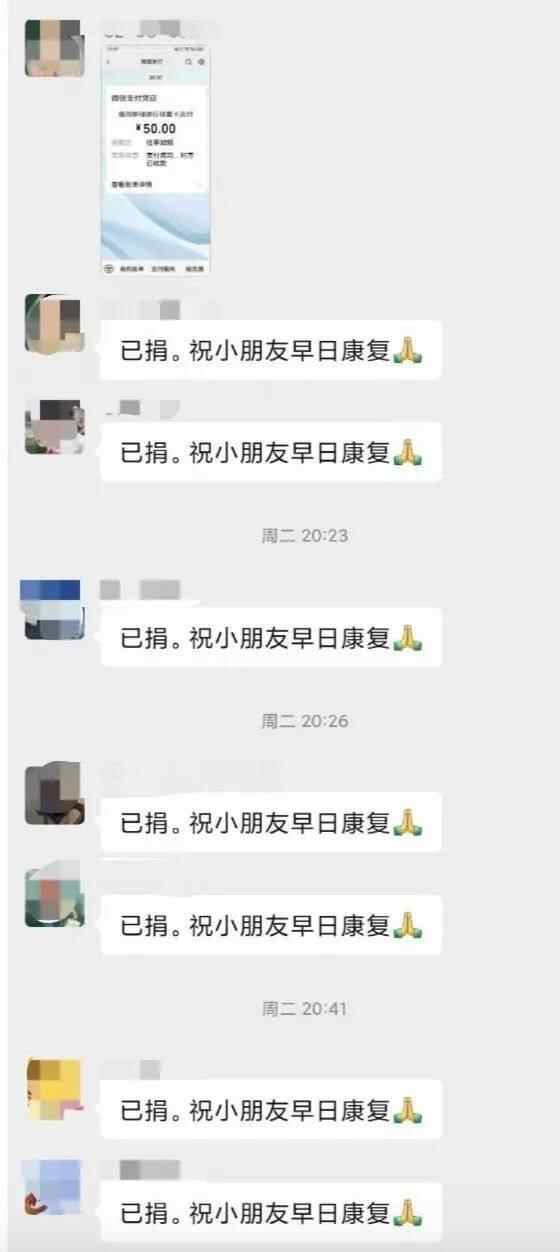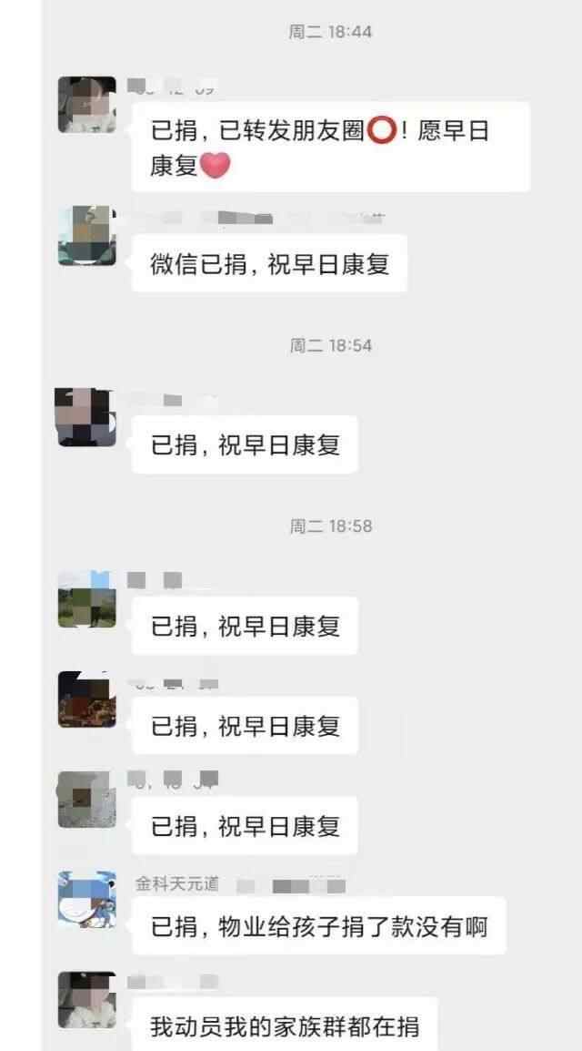 “已捐,祝早日康复”“转发了,让更多人看到”“我动员家族群都在捐”“尽自己微薄力量,希望孩子早点好起来”……在500人的业主群里,这样的信息刷屏,邻居们都在盼着孩子能够康复。