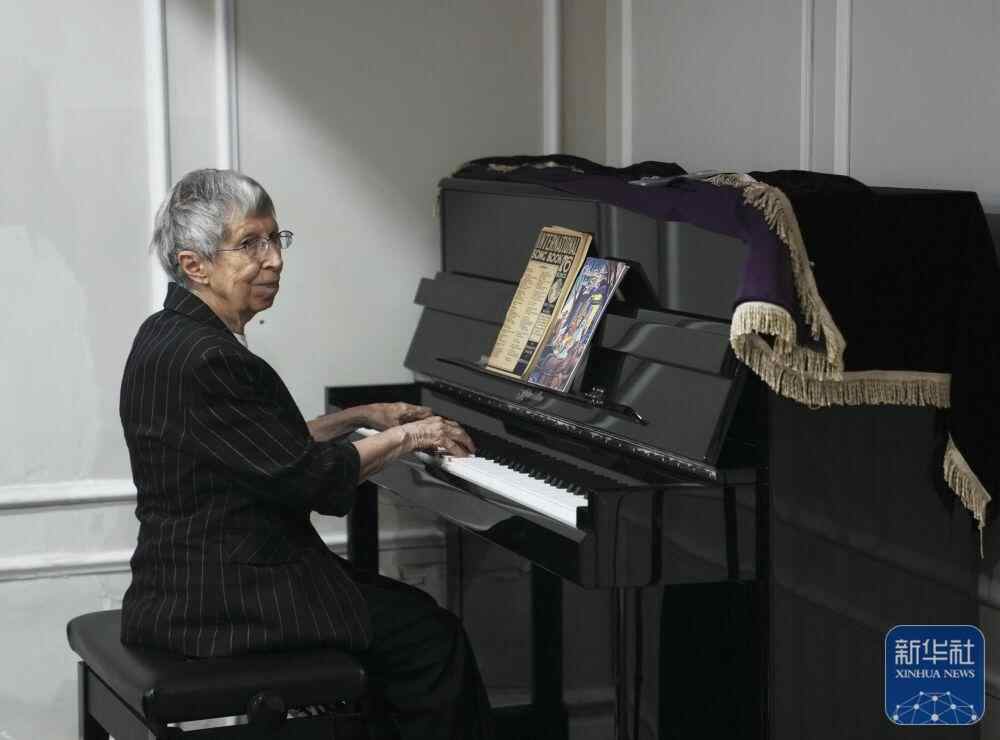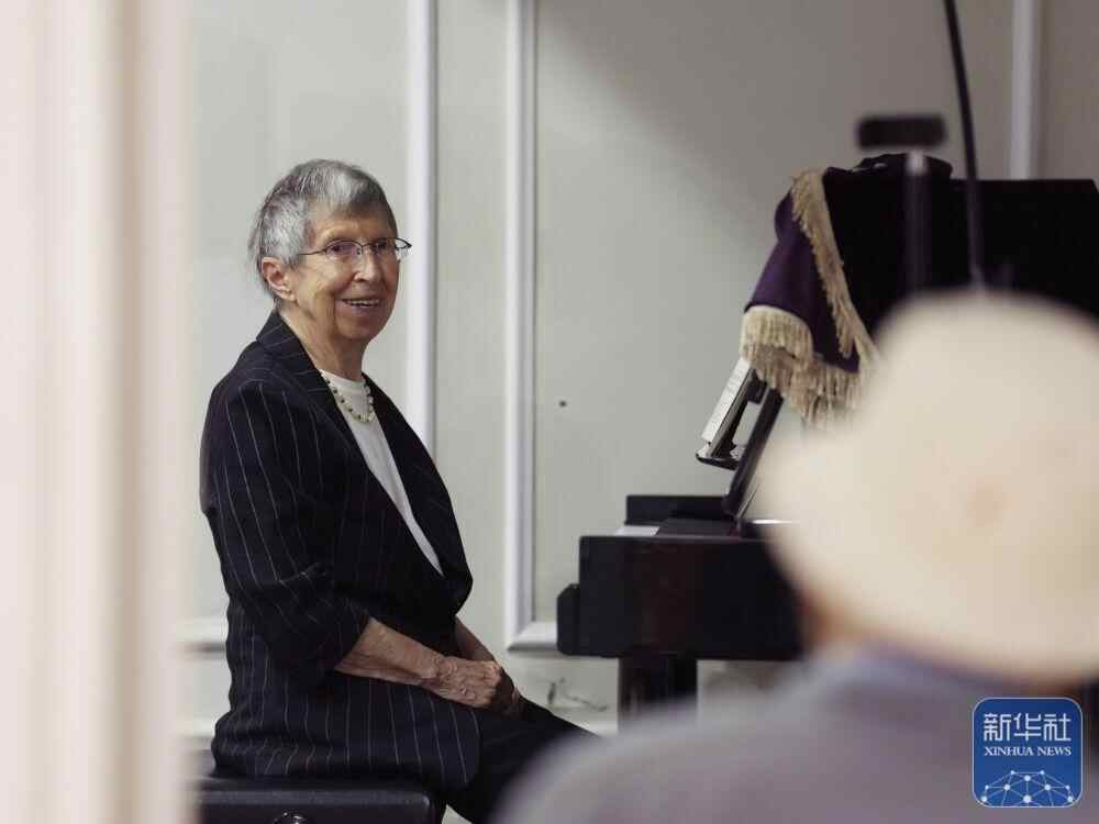 2025年6月13日,白丽诗在养老院的多功能厅弹钢琴。