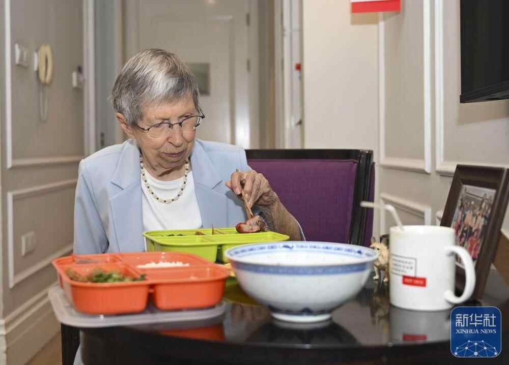 2025年6月13日,白丽诗在养老院的房间里用午餐。