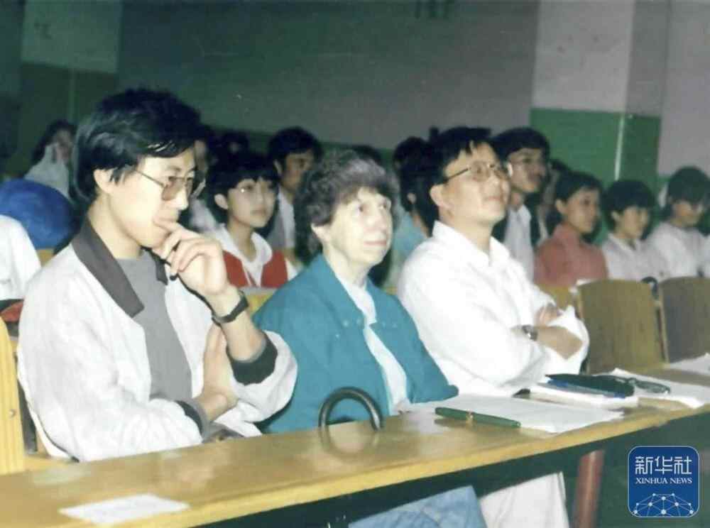 20世纪80年代,白丽诗(前中)在上海外国语大学任教时的工作照(翻拍照片)。