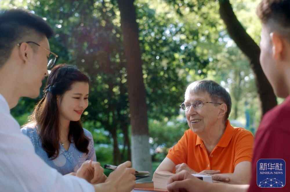 2019年,白丽诗与上海外国语大学的学生在一起。新华社发(上海外国语大学供图)