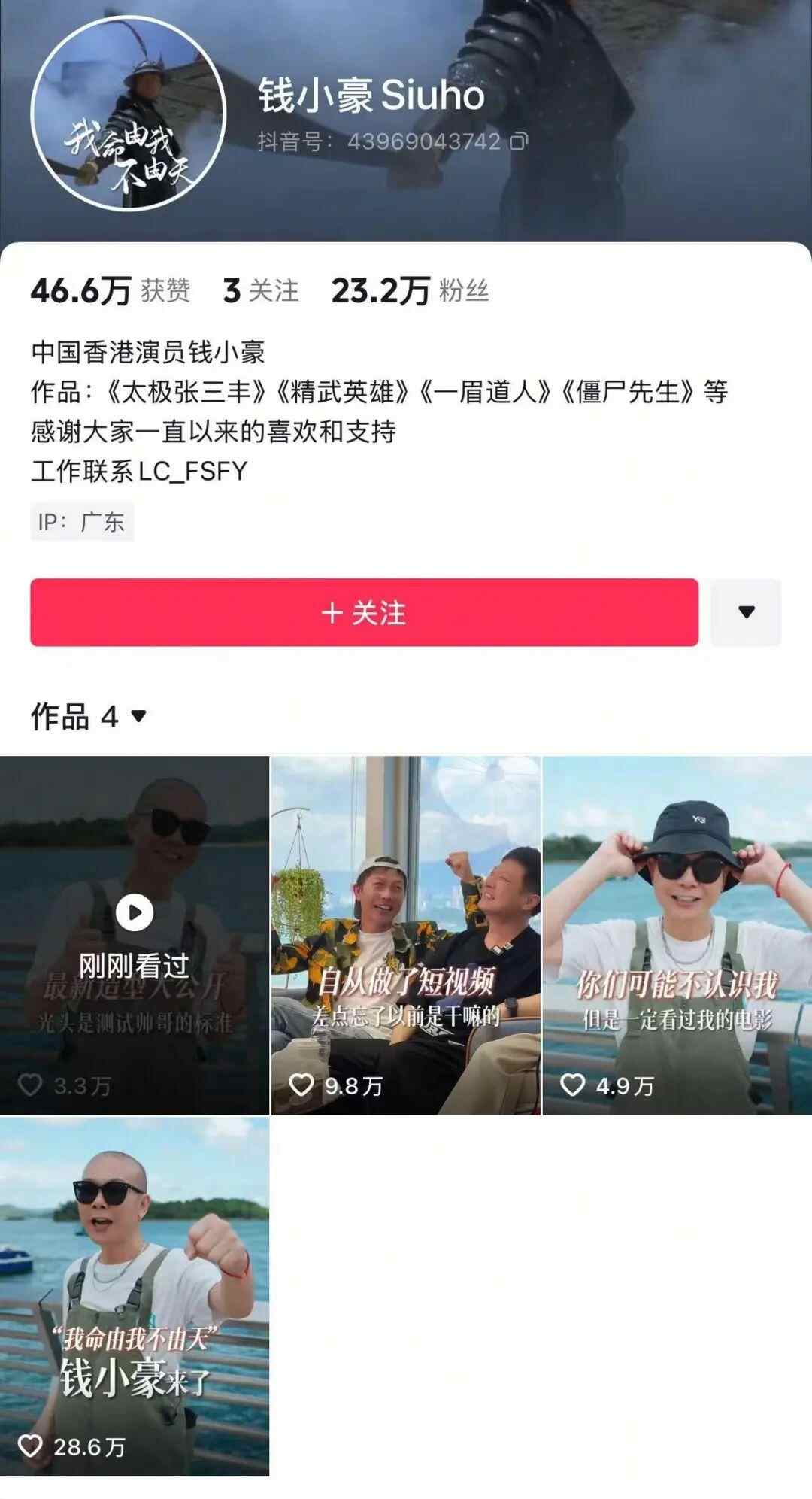 6月23日,钱小豪官宣入驻短视频平台。他的账号头像和封面,以及第一个自我介绍视频标题都来源于其经典作品《太极张三丰》里的经典台词:“我命由我不由天。”这也是许多80后的回忆。目前钱小豪短视频账号粉丝数已超23万。