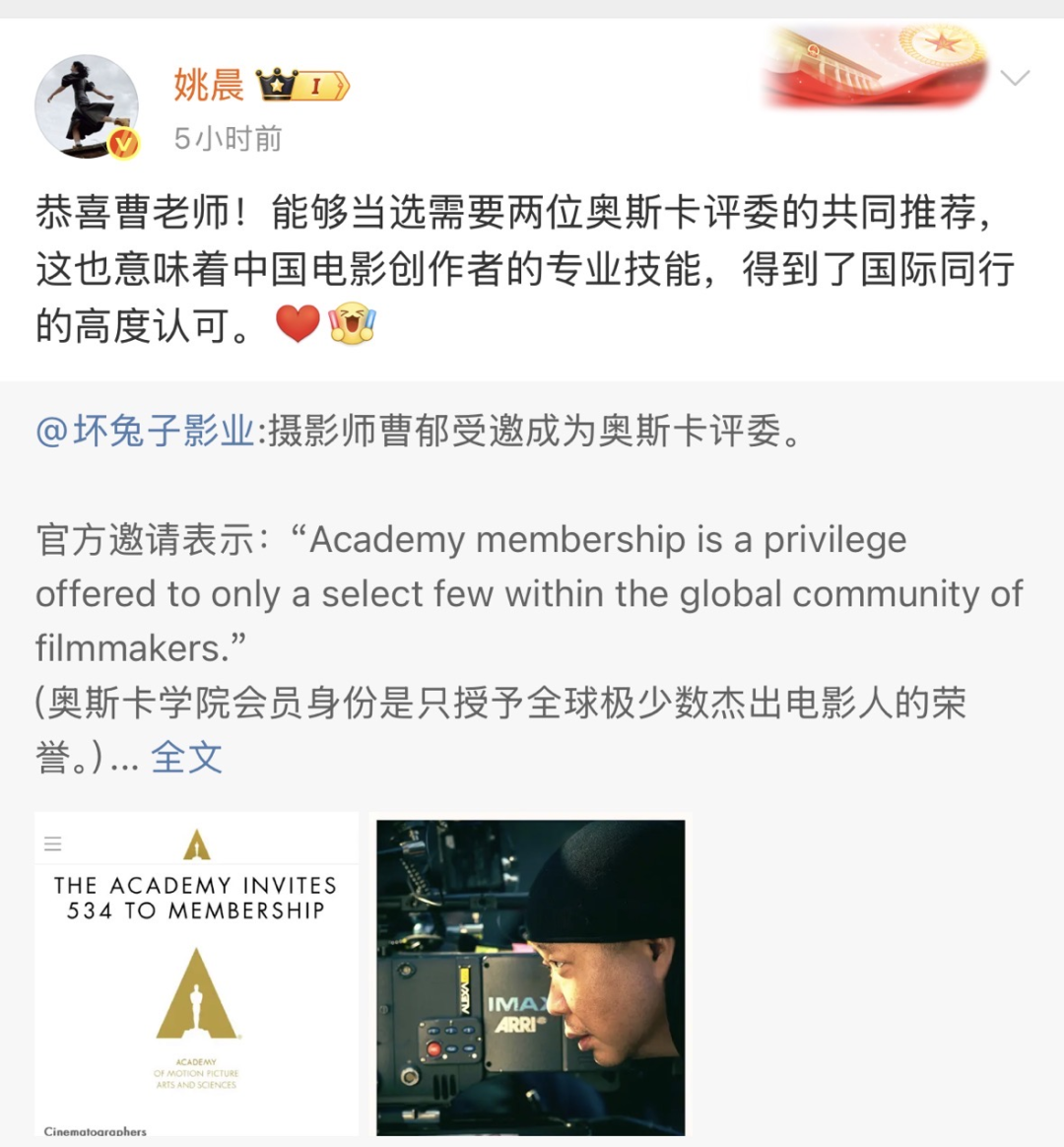 6月27日中午,姚晨在社交媒体发文,宣布了一个好消息:恭喜曹老师!能够当选需要两位奥斯卡评委的共同推荐,这也意味着中国电影创作者的专业技能,得到了国际同行的高度认可。