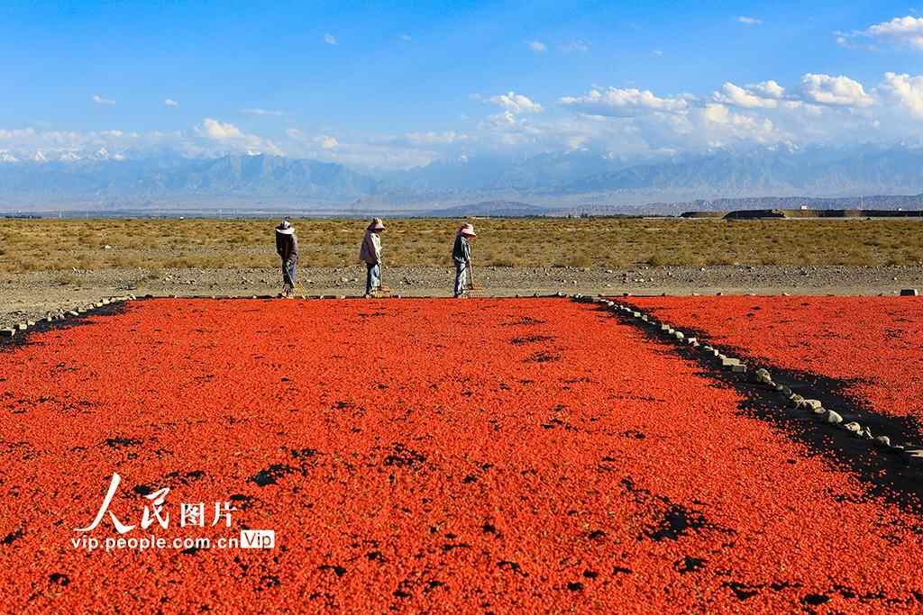 2025年6月26日,甘肃省嘉峪关市宏源公司的头茬枸杞喜获丰收,种植户们抢抓晴好天气采摘、晾晒。